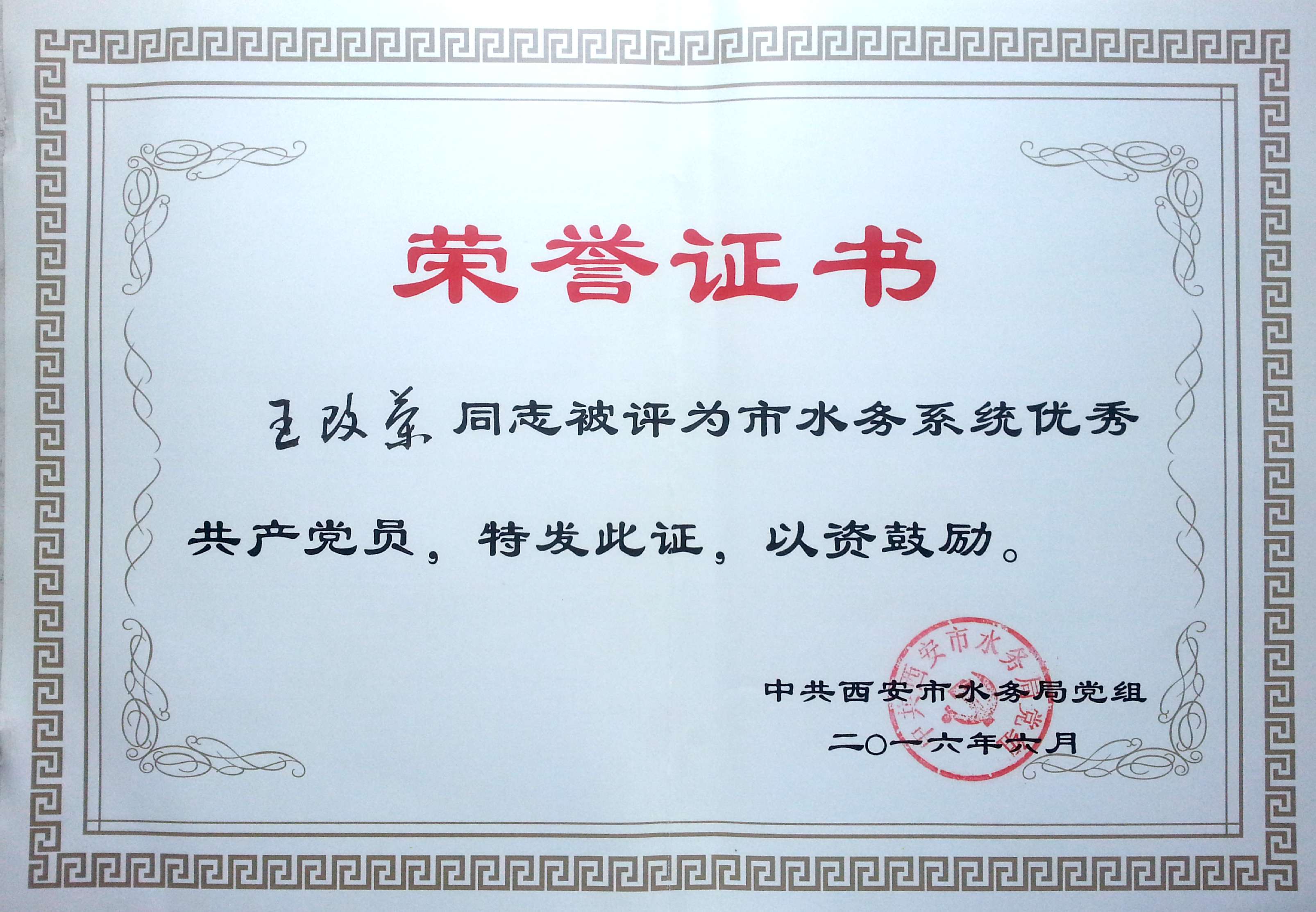 我單位王改榮同志,在2016年6月6日被中共西安市水務局黨組評為市水務系統(tǒng)優(yōu)秀共產黨員。